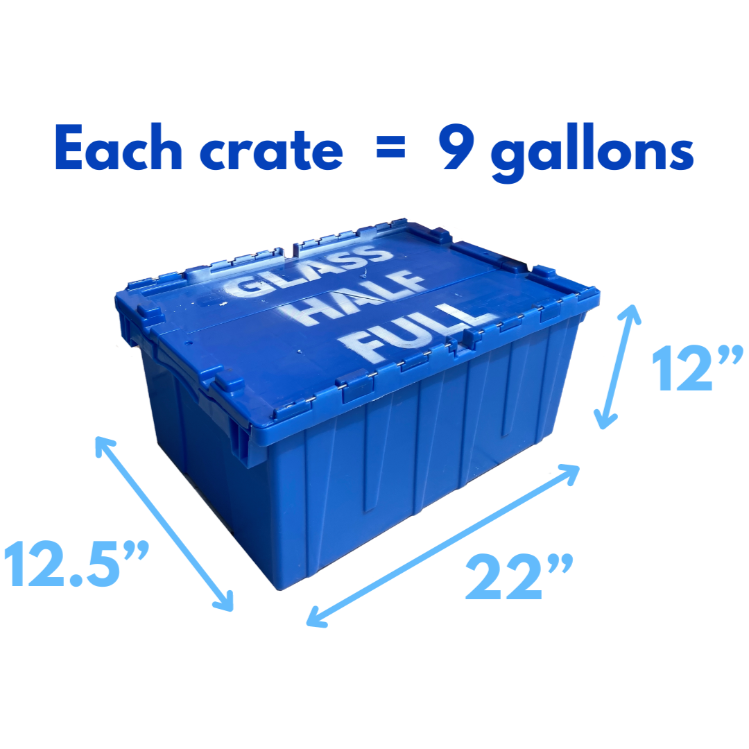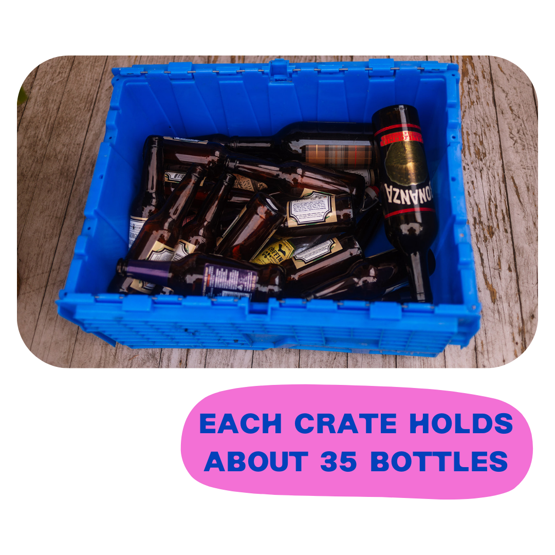 - Each crate is 9 gallons and measures 12.5” x 12” x 22” — they hold about 35 bottles per crate.